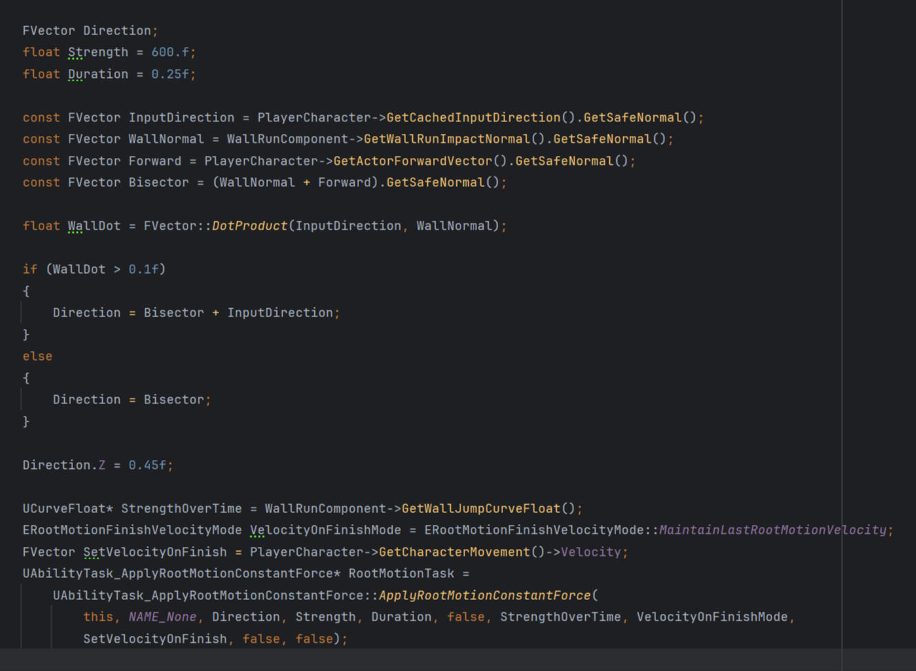 Code Screenshot showing how the input, curve, and normal of the wall make the wall jump work.